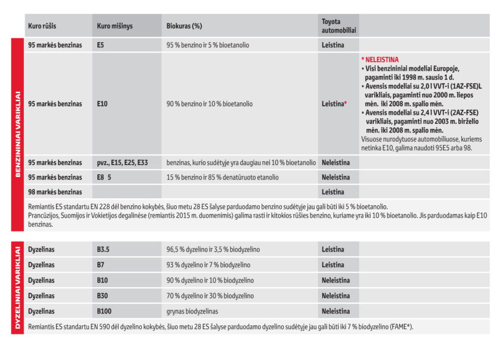 Biokuro gamybai gali būti naudojama daug įvairių išteklių. Šiuo metu didžioji dalis vadinamojo pirmosios kartos biokuro gaminama naudojant iš maistinių kultūrų išgautas žaliavas. Pavyzdžiui, bioetanolis gaminamas iš cukranendrių, o biodyzelinas – iš augalinių aliejų. Jie gali būti maišomi su benzinu arba dyzelinu Europos standartuose nurodytu santykiu. Europos rinkai pagamintuose Toyota ir Lexus automobiliuose galima naudoti benziną, kurio sudėtyje yra iki 10 proc. bioetanolio (E10, remiantis EN228 standartu), arba dyzeliną, kurio sudėtyje yra iki 7 proc. biodyzelino (B7, remiantis EN590 standartu).